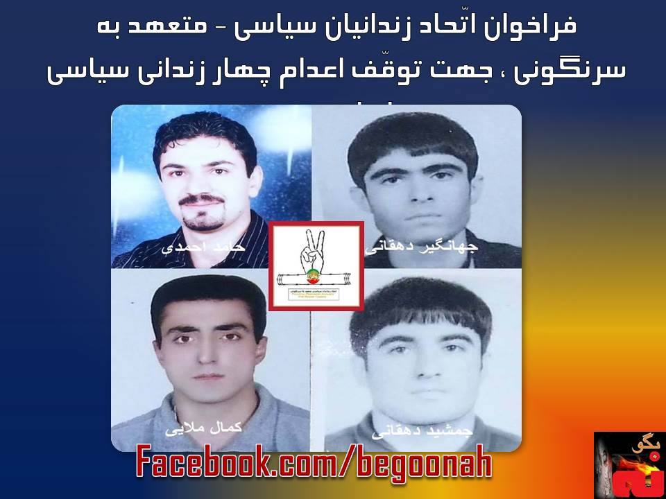 » اتحاد زندانیان سیاسی – متعهد به سرنگونی » ، از جنابعالی تقاضا دارد که به تلاشهایتان جهت توقف اعدام چهار زنداني سياسي اهل سنت، آّقايان جهانگير و جمشيد دهقاني، حامد احمدي و كمال ملايي سرعت بخشید.