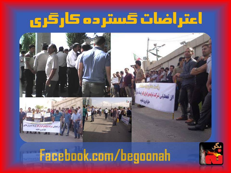 روز شنبه ۲۴خرداد ،۳۰۰ نفرازكارگران محروم شركت لاستيك سازي ايران تاير درمقابل ارگان موسوم به بنياد مستضعفان در تهران دست به تجمع اعتراضي زدند،اين بنياد غارت گر شركت ايران تاير را ازقبل به مالكيت خودش درآورده است ،كارگران محروم ايران تاير كه كارشان جزء مشاغل سخت هست وازابتداي سال جاري هيچگونه مزاياي مربوط به كارهاي سخت را همراه با دوماه حقوق دريافت نكرده اند ومجبورند بخاطر اينكه اخراج نشوند روزانه تا 12 ساعت كاربكنند ،به اين اقدامات ظالمانه كه ازطرف بنياد غارت مستضعفان توسط مديران نالايق اين شركت برعليه كارگران انجام ميشود تجمع اعتراضي امروز را برگزار كردند ودر پلاكاردهايي كه همراه خودشان برده بودند خواهان بركناري مديران نالايق اين شركت ورسيدگي به وضعيت خودشان شدند. لازم به ياد آوري است كه طي ماههاي اخير اين سومين تجمع اعتراضي كارگران ايران تاير است كه انجام ميشود وهنوز كارگران به نتيجه اي نرسيده اند