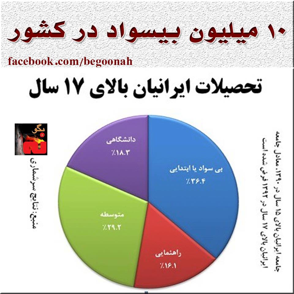 در حالیکه براساس «سند چشم انداز“ رژیم آخوندی می بایست تا پایان سال ۹۴ بیسوادی در گروه سنی کمتر از پنجاه سال ریشه کن ميكرد، سایت حکومتی جام جم با پرده برداشتن از شکست سیاست های رژیم آخوندی در این زمینه نوشت: « نزدیک به ده میلیون نفرازجمعیت کشور بیسواد مطلق اند که نزدیک به چهارمیلیون نفرازآنها کمترازپنجاه سال سن دارند. لابه لای این جمعیت نیز ده میلیون نفردارای مدرک ابتدایی، ۹ میلیون نفرصاحب مدرک راهنمایی و سیزده میلیون نفرتحصیلات متوسطه دارند که نشان میدهد برخلاف تصورهمگانی که بیشترافراد جامعه رامدرک به دستان دانشگاهی میدانند، بخش قابل توجهی ازجمعیت کشوررا افراد بیسواد وکم سواد تشکیل میدهد».