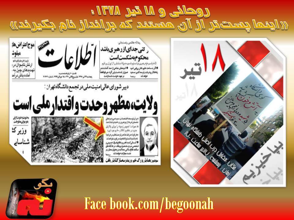 گالری فیلم و تصویر آخوند روحانی و ۱۸ تیر ۱۳۷۸ Date: ژوئیه 10, 2014Author: begoonah 0 دیدگاه آخوند روحانی و ۱۸ تیر ۱۳۷۸ ؛ «اینها پستتر از آن هستند که برانداز نام بگیرند» آخوند حسن روحانی در سال ۷۸ دانشجویان معترض در واقعه ۱۸ تیر را اوباش و برانداز خطاب کرد. او گفت: «اینها پستتر از آن هستند که برانداز نام بگیرند». اشتراکگذاری این:بیشتر برای اشتراکگذاشتن فیسبوک خود کلیک کنید (در پنجرۀ تازه باز میشود) فیسبوک اشتراک گذاشتن توسط اس ام اس (در پنجرۀ تازه باز میشود) X برای چاپ کردن کلیک کنید (در پنجرۀ تازه باز میشود) چاپ برای اشتراکگذاری روی Telegram کلیک کنید (در پنجرۀ تازه باز میشود) تلگرام برای اشتراکگذاری روی WhatsApp کلیک کنید (در پنجرۀ تازه باز میشود) واتساپ