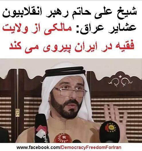 شیخ علی حاتم امیر عشایر دلیم عراق در یک کنفرانس مطبوعاتی گفت: مالکی با جنگ علیه استانهای به پاخاسته و هدف قرار دادن آنها بر اساس مذهبشان و نیز دشمنی با کردها، نشان داده که به طور کامل از ولایت فقیه در ایران پیروی می کند.