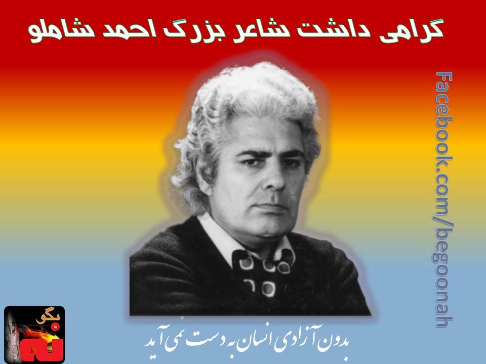 احمد شاملو (۱٣۰۴ – ۱٣۷۹) شاعر، مترجم، نویسنده، پژوهش گر و عضو برجسته ی کانون نویسندگان ایران اکنون چهارده سال است که قلمش از تکاپو بازایستاده اما قلبش در حنجره ی بسیارانی که شعرهایش را زمزمه می کنند همچنان می تپد.
