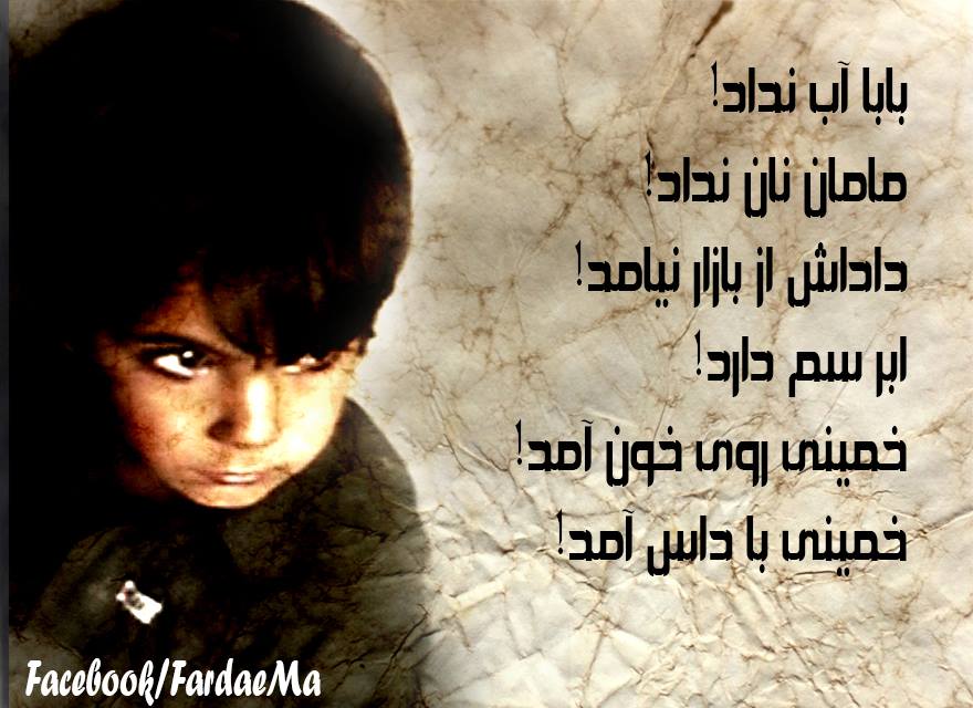بعد ادامه داد: داداش از بازار نيامد. چون گشت كودكان خياباني او را دستگير كرد و برد. ابر سم دارد.چون از ابر آسمان اهواز سم مي بارد و در تهران دود مي بارد و بابا زير باران لباسهايش سياه شد! اينها همش از روزي شروع شد كه آن مرد روي خون آمد! خميني با داس آمد!