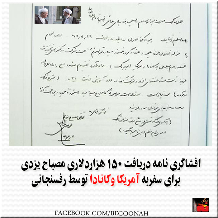 رفسنجانی نامه دریافت ۱۵۰ هزار دلاری مصباح یزدی برای سفر به آمریکا و کانادا را افشا کرد