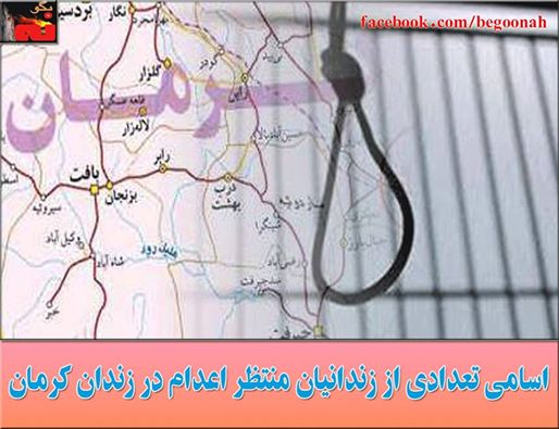 به گزارش كانون حمايت از خانواده جان باختگان و بازداشتي ها ،رژیم آخوندی قصد دارد چند زندانی را در کرمان اعدام کند. رژیم ضد بشری از احتمال اعدام این عده بعد از عید فطر خبر داده است. اسامی این زندانیان عبارتند از: نعمت الله پگاه، ابوذر اسدی، حامد حیدری، وحید حیدری، محمود سابکی، محمدرضا مظلومی. حامد اسدآبادی. نوید نارویی، عبدالله فلاحی، محمد شهریاری، حسین کریم آبادی، حسن سرحدی، مهدی زابلی، محمد شهرکی، محمد امین درویشی، علی رنجبر، حسین عرب، عباس مداینزاده، جلیل شهرکی، محسن اسماعیلی، محمد جواد حسن ابادی، محمدعلی رضایی، سید مالکی، نژاد عبدالله نیکان، مرتضی ذاکری، سعید عشایری، روزبه یابنده، صدیق سنگک، روح الل خالقی، اسلام رکن دینی و یاسر سعیدی.