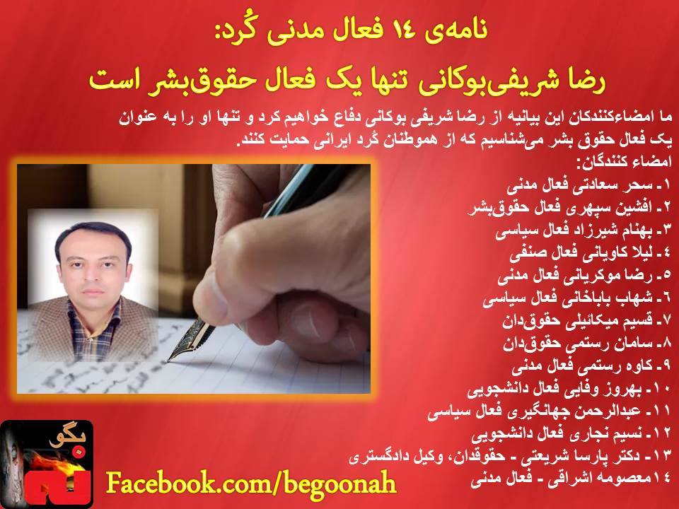 ما جمعی از فعالین سیاسی، حقوقبشری، صنفی و فعالین دانشجویی کُرد در کُردستان ایران حمایت خود را از رضا شریفی بوکانی اعلام میداریم و از تمامی نهادها و مدافعین حقوقبشر به ویژه شخص احمد شهید میخواهیم در این باره اقدامات لازم را مبذول بفرمایند.