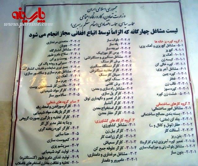 گالری فیلم و تصویر ليست مشاغل مجاز براي شهروندان افغان در ايران تحت حاكميت رژيم سراپا جنايت و فساد و تبعيض و ستم ولايت فقيه Date: آگوست 2, 2014Author: begoonah 0 دیدگاه اشتراکگذاری این:بیشتر برای اشتراکگذاشتن فیسبوک خود کلیک کنید (در پنجرۀ تازه باز میشود) فیسبوک اشتراک گذاشتن توسط اس ام اس (در پنجرۀ تازه باز میشود) X برای چاپ کردن کلیک کنید (در پنجرۀ تازه باز میشود) چاپ برای اشتراکگذاری روی Telegram کلیک کنید (در پنجرۀ تازه باز میشود) تلگرام برای اشتراکگذاری روی WhatsApp کلیک کنید (در پنجرۀ تازه باز میشود) واتساپ