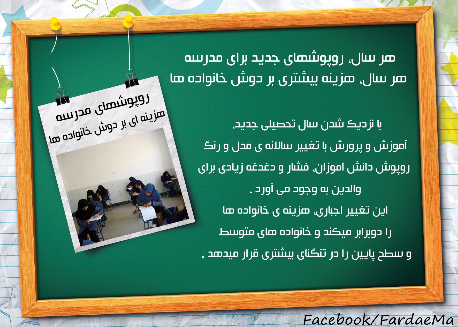 با نزديك شدن سال تحصيلي جديد، آموزش و پرورش با تغيير سالانه ي مدل و رنگ روپوش دانش آموزان، فشار و دغدغه زيادي براي والدين به وجود مي آورد. اين تغيير اجباري، هزينه ي خانواده ها را دوبرابر ميكند و خانواده هاي متوسط و سطح پايين را در تنگناي بيشتري قرار ميدهد. اما يكي از كارگزاران رژيم، رضا طاهرخاني، از معاونين آموزش و پرورش استان قزوين تقصير را به گردن والدين و مديريت مدرسه انداخت و گفت اين تصميمات معمولا با مشورت بين مديريت مدرسه و انجمن اوليا و مربيان گرفته ميشود و خودشان بايد شرايط همه اقشار را در نظر بگيرند!