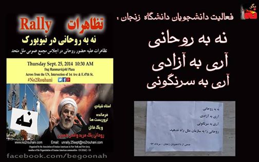 دانشجویان دانشگاه زنجان با نصب تراکتهایی بر روی دیوارهای این شهر، به سفر آخوند روحانی به سازمان ملل متحد اعتراض کردند.