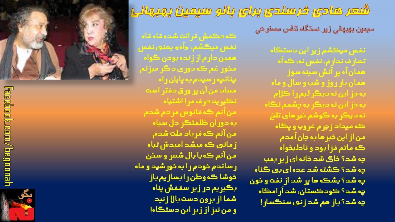 هادی خرسندی :این ایمیل را دیروز یکی از نزدیکان خانم بهبهانی برای استاد جلیل دوستخواه در استرالیا فرستاده که به لطف دوست مشترکی به دست من (هادی خرسندی) رسیده: