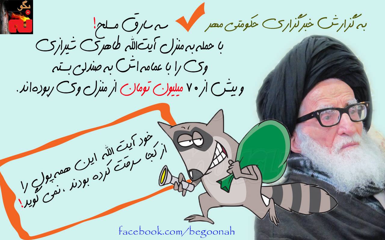 گالری فیلم و تصویر سرقت از خانه آخوند طاهری شیرازی Date: آگوست 15, 2014Author: begoonah 0 دیدگاه به گزارش خبرگزاری حكومتي مهر، سه سارق مسلح! با حمله به منزل آخوند طاهری شیرازی وي را با عمامه اش به صندلي بسته و بیش از ٧٠ میلیون تومان از منزل وی ربودهاند. » اشتراکگذاری این:بیشتر برای اشتراکگذاشتن فیسبوک خود کلیک کنید (در پنجرۀ تازه باز میشود) فیسبوک اشتراک گذاشتن توسط اس ام اس (در پنجرۀ تازه باز میشود) X برای چاپ کردن کلیک کنید (در پنجرۀ تازه باز میشود) چاپ برای اشتراکگذاری روی Telegram کلیک کنید (در پنجرۀ تازه باز میشود) تلگرام برای اشتراکگذاری روی WhatsApp کلیک کنید (در پنجرۀ تازه باز میشود) واتساپ