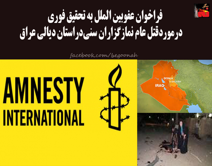 عفو بین الملل قتل عام نمازگزاران سنی توسط شبه نظامیان مالکی در استان دیالی عراق محکوم کردو خواستار تحقیق در مورد این جنایت تکان دهنده شد.