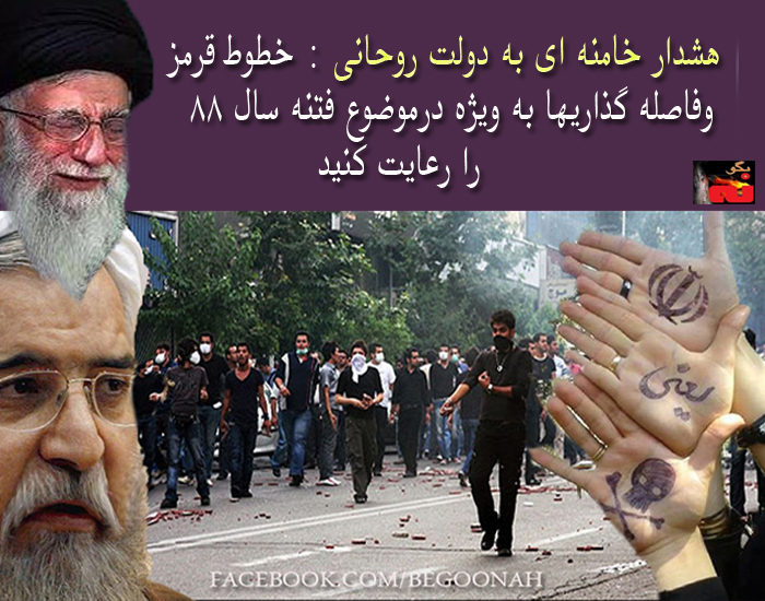 خامنه ای ولی فقیه ارتجاع امروز چهارشنبه 5شهریور در دیدار با آخوند روحانی و اعضای کابینه اش هشدار داد: «خطوط قرمز و فاصله گذاریها به ویژه در موضوع فتنه ی سال ۸۸ را رعایت کنید و در قبال انتقادهای منصفانه سعه ی صدر و آرامش خود را حفظ کنید»
