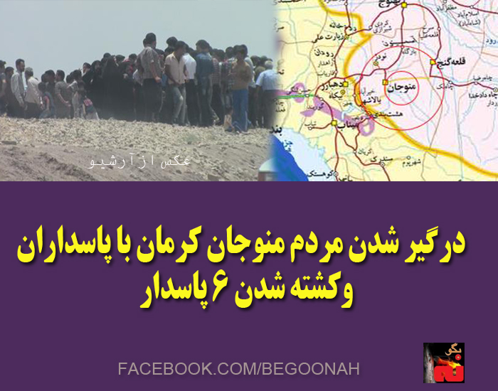 اهالی منوجان در استان کرمان روز چهارشنبه 12شهریور با نیروهای سپاه پاسداران که مشغول اخاذی و راهزنی در جاده های این منطقه بودند، درگیر شدند و 6تن از آنان را به هلاکت رساندند.