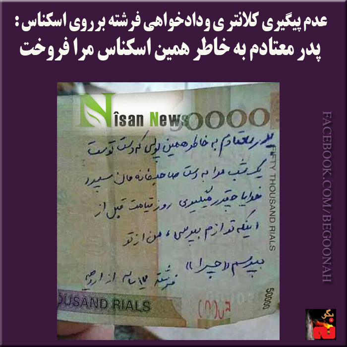 عکس یادداشت فرشته بر روی اسکناس، پس از ناامیدی وی از رسیدگی به شکایتش برروی اسکناس درخبرگزاری حکومتی “نیسان نیوز” منتشر شده است .