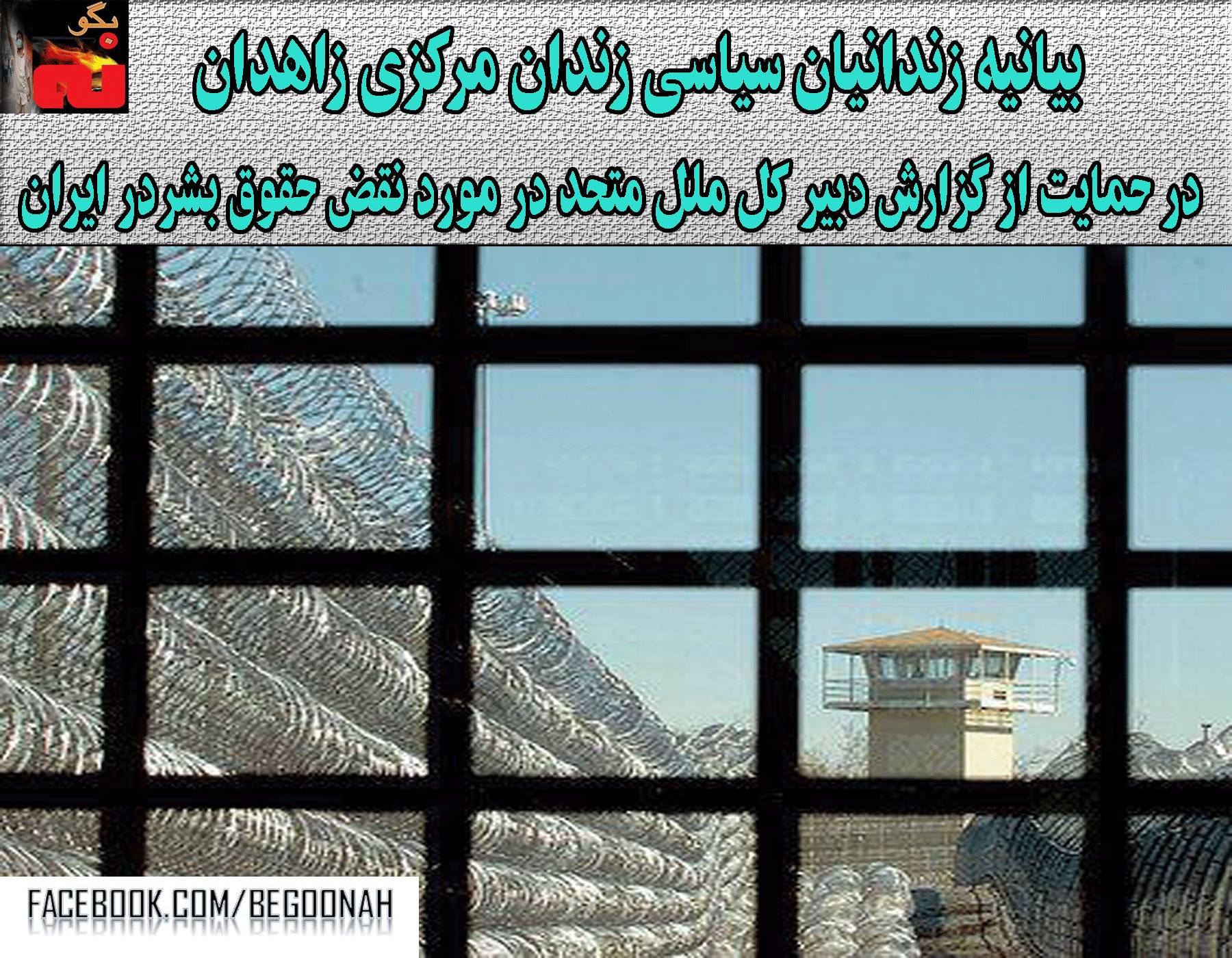 اینجانبان زندانیان سیاسی زندان زاهدان حمایت خود را از گزارش دبیر کل محترم سازمان ملل متحد و نماینده ویژه آن جناب آقای دکتر حمد شهید در خصوص نقض حقوق بشر توسط رژیم ایران اعلام نموده و همچنین پاسخهای غیرمنطقی و نابخردانه مقامات ایران را نسبت به این بیانیه محکوم می نماییم.