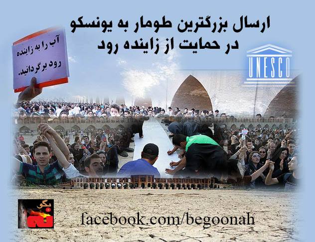 جمعي از حاميان محيط زيست در حمايت از » زاينده رود» و » تالاب گاوخوني»، ضمن اعلام «درد مشترك تمامي اقشار و مشاغل استان اصفهان» با امضاي طوماري به طول ٦٠٠ متر صداي نارضايتي خود را به گوش کارگزاران رژیم ، همچنين نهادهاي بينالمللي همچون يونسكو ميرسانند.