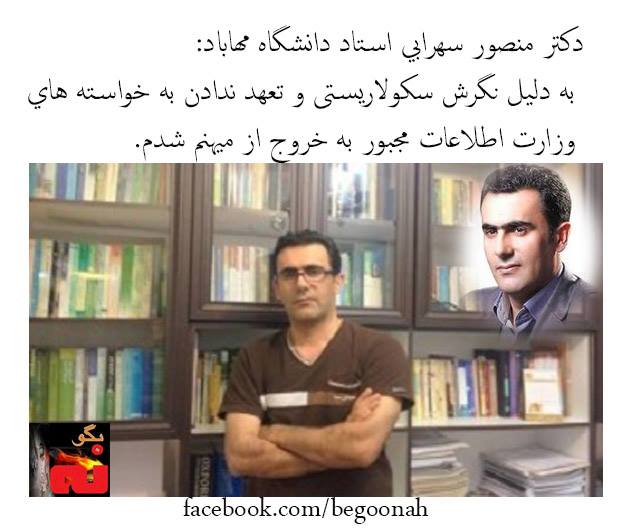 دكتر منصور سهرابي پژوهشگر علمي و از اساتید دانشگاهی در کُردستان كه به سبب تهدید و احضارهای پیدرپی به ادارهی اطلاعات مهاباد، به مدت سه سال بالاجبار از ایران خارج شد.