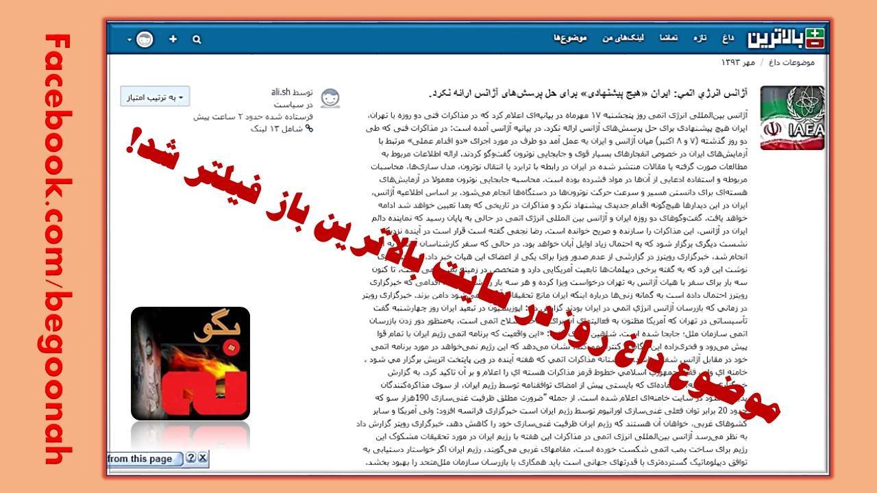 موضوع داغ فيلتر شده در بالاترين كه شامل ۱۳ لینک در بخش سياست مي باشد كه حدود ۲ ساعت پیش ارسال شده و بنابه گفته كاربران بلافاصله سانسور گرديده است.