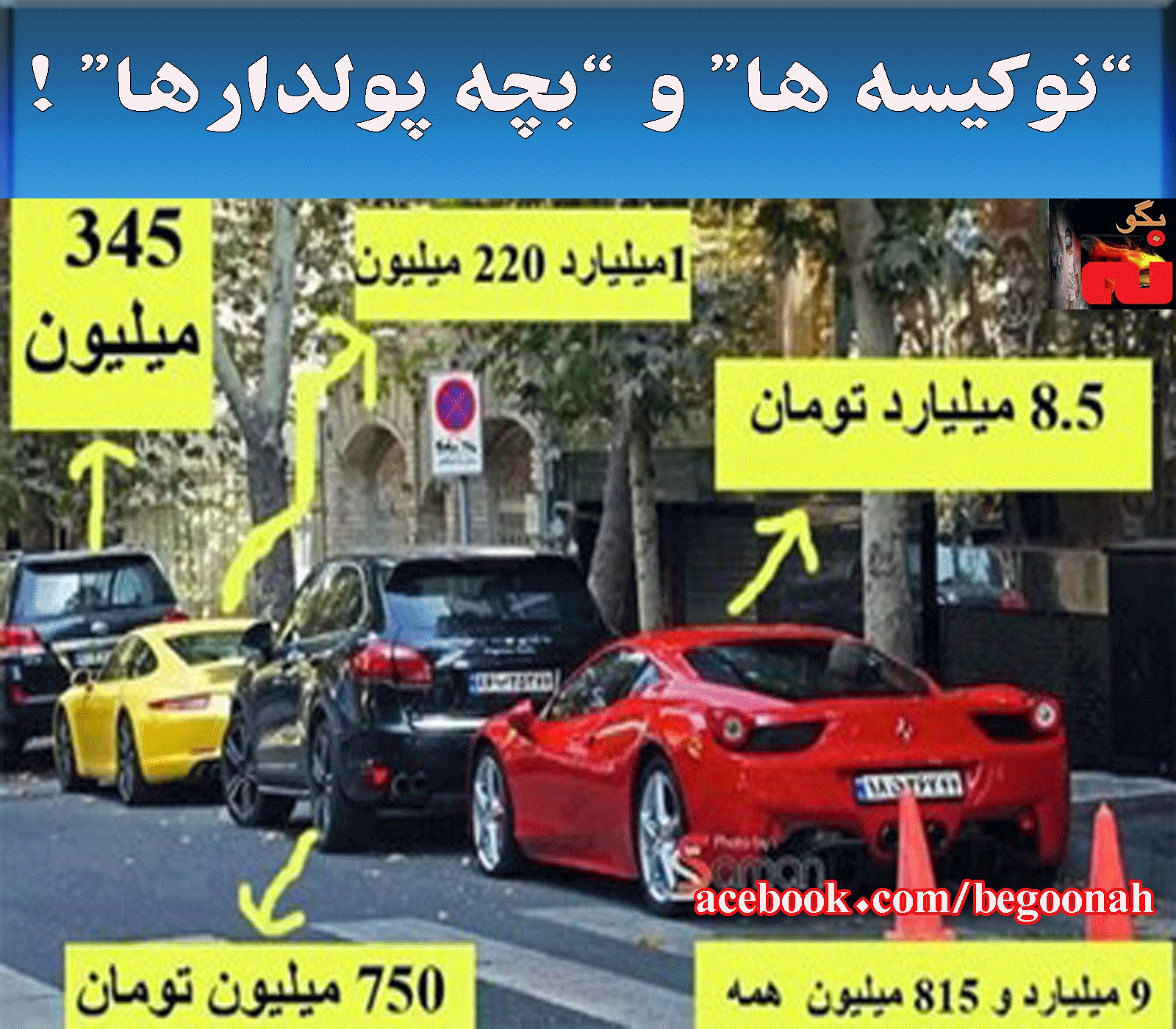 بچه پولدارها با خودروهای ۷۰۰ تا ۸۰۰ میلیون تومانی تا یک میلیارد تومانی، بچههای همین کارگزاران و مهرههای رژیم و وابسته به این قشر نوکیسه هستند که در حاکمیت آخوندها قارچ گونه رشد کردهاند وحیات انگلی خود را مرهون نظام فاسد ولایتفقیه هستند.