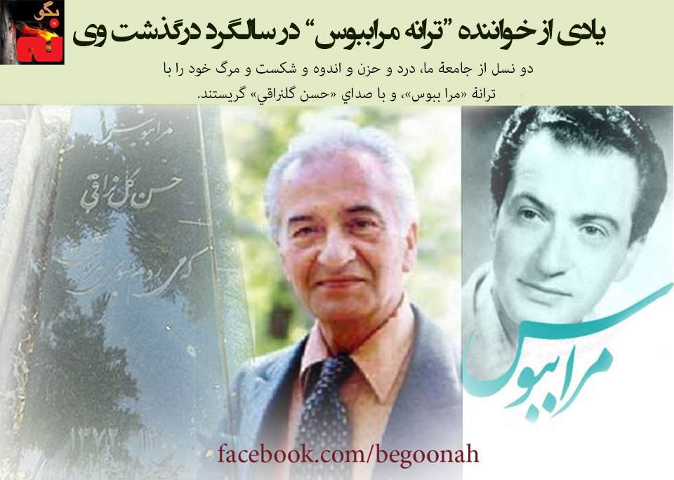 سال 1332 که ضربۀ کودتاي 28 مرداد، به نهضت ملي و اميد ملتي براي رهايي پايان داد، و در آن روزهاي سياه شکست که در ميدانهاي اعدام، مرگ قهرمانانه را به سينۀ مردمدوستي و شجاعت سپر ميکردند، نسلي با ترانۀ «مرا ببوس» که در همان روزها پخش شد گريست و خواند که: «در ميان توفان، همپيمان با قايقرانها ـ گذشته از جان بايد بگذشت از توفانها» حسن گلنراقی كه در سال ۱۳۰۰ شمسي در كوچه آبشار خيابان ري در تهران بدنيا آمد و در مهر ماه سال ۱۳۷۲ در تهران بدرود حيات گفت خوانندهٔ ترانه به ياد ماندني « مرا ببوس » است که بیشتر بهخاطر سرودن زيباي اين ترانه معروف است.