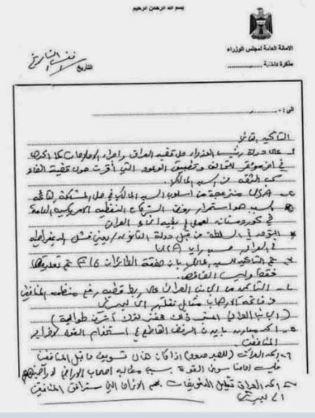 اين سند، صورتجلسه نشست ويژه مالكي با سرپرست وزارت كشور، مشاور امنيتي ، هيأت مشاوران امنيت ملي ، مديركل پليس عراق و فرمانده پليس فدرال در ساعت 10 شنبه شب 28 سپتامبر 2013 (6 مهر 1392) درباره گروگانهاي اشرفي و دستورات مالكي در همين خصوص براي رد گم كردن و زدودن آثار جرم در منتهاي ترس و وحشت از فاش شدن حقايق است. اين سند جنايت مالكي در خدمت به ولايت خامنه اي وقابل پيگرد در هر دادگاه بين المللي است.
