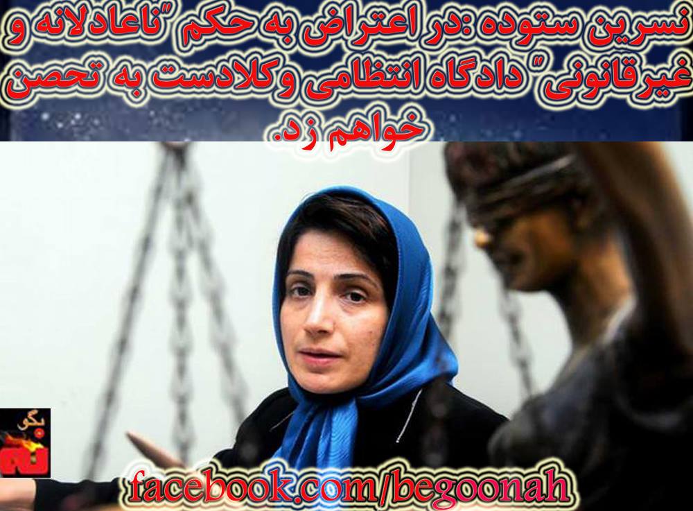 نسرین ستوده میگوید به این حکم اعتراض حقوقی نمیکند چرا که قوه قضائیه را دستگاهی «ناعادل» میداند که او و همکارانش را تنها به دلیل انجام وظایف شغلیشان بازداشت و محاکمه کرده است.