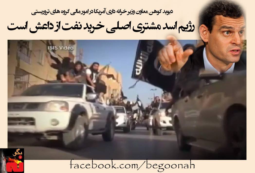 یوید کوهن معاون وزیر خرانه داری آمریکا در امور مالی گروه های تروریستی شامگاه پنج شنبه 23-10-2014 در جمع خبرنگاران برای اولین بار اعلام کرد که رژیم اسد مشتری اصلی خرید نفت از داعش است.
