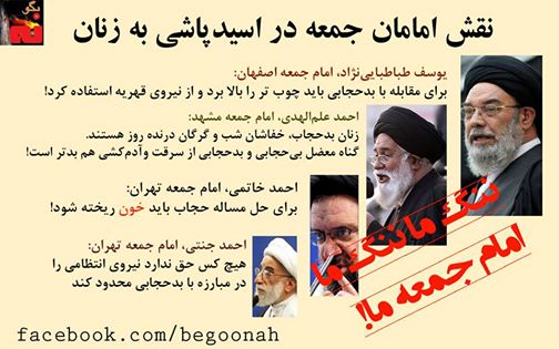 گالری فیلم و تصویر امامان جمعه چه نقشی در اسيدپاشى به زنان داشته اند؟ Date: اکتبر 25, 2014Author: begoonah 0 دیدگاه چرا مردم اصفهان در اعتراض به اسیدپاشیها شعار میدادند:«امام جمعه ما، ننگ ماست، ننگ ماست» و «امام جمعه، استعفا استعفا»… #بگونه #اسیدپاشی #زنان #جنایت #رژیم #ابوداعش اشتراکگذاری این:بیشتر برای اشتراکگذاشتن فیسبوک خود کلیک کنید (در پنجرۀ تازه باز میشود) فیسبوک اشتراک گذاشتن توسط اس ام اس (در پنجرۀ تازه باز میشود) X برای چاپ کردن کلیک کنید (در پنجرۀ تازه باز میشود) چاپ برای اشتراکگذاری روی Telegram کلیک کنید (در پنجرۀ تازه باز میشود) تلگرام برای اشتراکگذاری روی WhatsApp کلیک کنید (در پنجرۀ تازه باز میشود) واتساپ