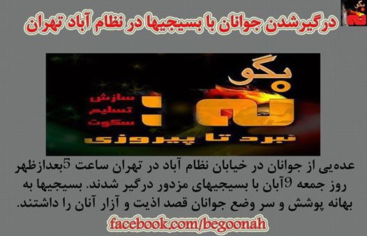 اخبار درگیرشدن جوانان با بسیجیان درنظام آباد تهران Date: نوامبر 3, 2014Author: begoonah 0 دیدگاه اشتراکگذاری این:بیشتر به اشتراک گذاشتن در فیسبوک (در پنجرۀ تازه باز میشود) فیسبوک اشتراکگذاری در X (در پنجرۀ تازه باز میشود) X چاپ (در پنجرۀ تازه باز میشود) چاپ اشتراکگذاری در تلگرام (در پنجرۀ تازه باز میشود) تلگرام اشتراکگذاری در واتساپ (در پنجرۀ تازه باز میشود) واتساپ