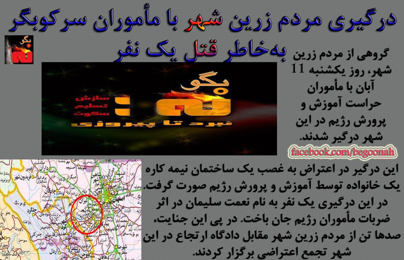 اخبار درگیری مردم زرین شهر با ماموران سرکوبگر به خاطر قتل یک نفر Date: نوامبر 3, 2014Author: begoonah 0 دیدگاه اشتراکگذاری این:بیشتر برای اشتراکگذاشتن فیسبوک خود کلیک کنید (در پنجرۀ تازه باز میشود) فیسبوک اشتراک گذاشتن توسط اس ام اس (در پنجرۀ تازه باز میشود) X برای چاپ کردن کلیک کنید (در پنجرۀ تازه باز میشود) چاپ برای اشتراکگذاری روی Telegram کلیک کنید (در پنجرۀ تازه باز میشود) تلگرام برای اشتراکگذاری روی WhatsApp کلیک کنید (در پنجرۀ تازه باز میشود) واتساپ