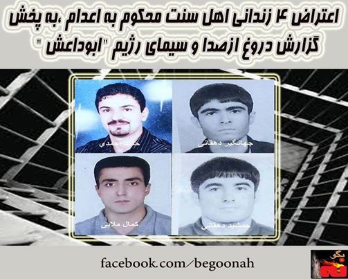 اعتراض ۴ زندانی اهل سنت محکوم به اعدام ،به پخش گزارش دروغ صدا و سیمای رژیم » ابوداعش «
