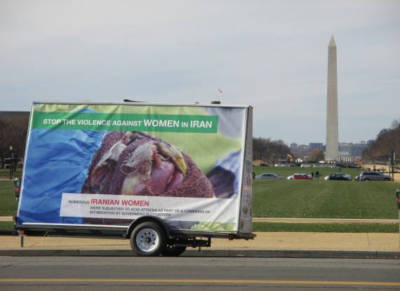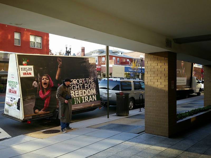بر روی بیلبردهای متحرکی که در خیابانهای پر رفت و آمد و از مقابل ساختمانهای مهم شهر واشينگتن همچون ساختمان کنگره و کاخ سفید و نیز دفتر حافظ منافع رژيم آخوندها در امریکا چرخانده شدند، نوشته شده بود: «خشونت علیه زنان در ایران را متوقف کنید.»