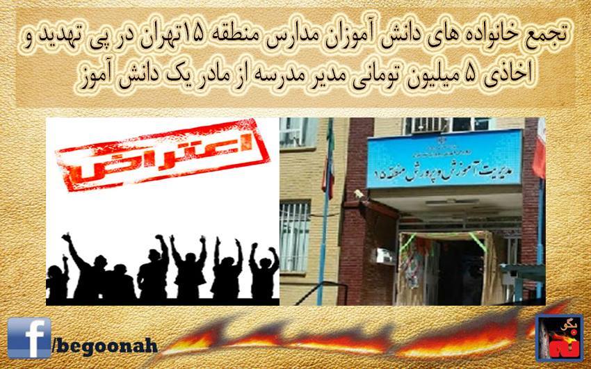 تجمع خانواده های دانش آموزان مدارس منطقه ۱۵تهران در پی تهديد و اخاذي ۵ ميليون توماني مدير مدرسه از مادر يك دانش آموز
