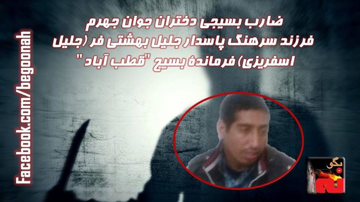 بنابه اخبار منتشره در باره جنايت تازه بسيجي هاي خامنه اي در جهرم ضارب جنايتكار يك بسيجي 22 ساله به نام محمد بهشتی فر است كه عضو سازمان بسیج ضد مردمي «قطب آباد»و فرزند سرهنگ پاسدار جلیل بهشتی فر (جلیل اسفریزی) فرماندۀ بسیج «قطب آباد» (روستایی در ده کیلومتری شهر جهرم) است.