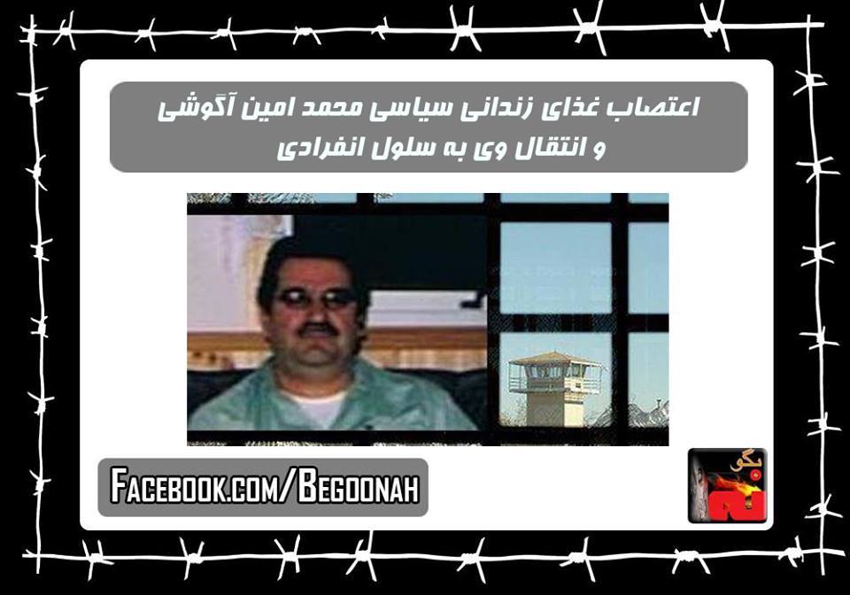بنا به گزارش فعالین حقوق بشر و دمکراسی در ایران ، روز پنجشنبه ۱۳ آذر ماه معلم بازنشسته زندانی سیاسی محمد امین آگوشی در اعتراض به یورش وحشیانه به سلولش، رفتارهای تحقیر آمیز و تخریب وسایل شخصی اش و عدم رسیدگی به اعتراضات وی ناچار به اعتصاب غذا شد.