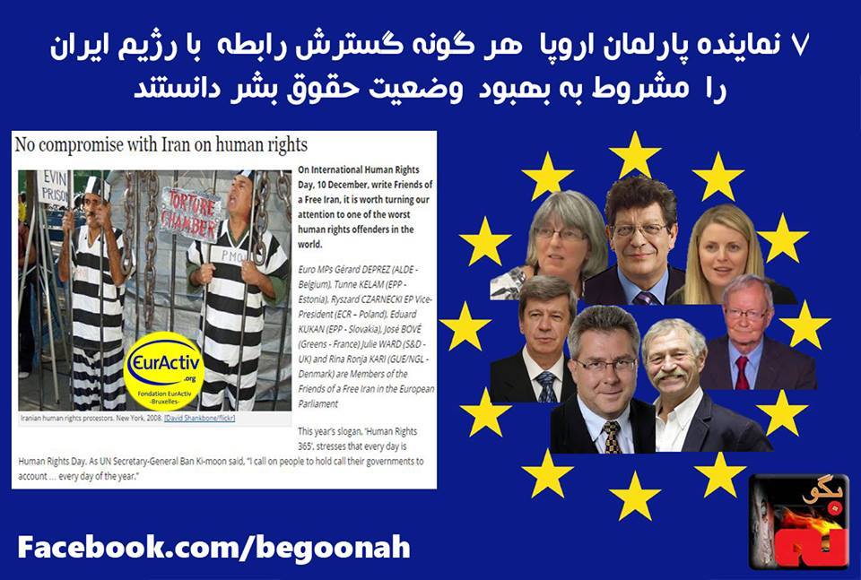 همزمان با روز جهانی حقوقبشر هفت نماینده پارلمان اروپا ، طی مقالهیی در یورو اکتیو سایت خبری اتحادیه اروپا که به 27 زبان منتشر میشود، تداوم و تشدید نقض فاحش حقوقبشر توسط رژیم ايران بهویژه جنایتهای اين رژیم علیه زنان و افزایش موج وحشیانه اعدامها در دوران آخوند حسن روحانی را محکوم نموده و اين اتحاديه را فراخواندند تا هر گونه گسترش رابطه با رژيم ايران را به بهبود وضعیت حقوقبشر مشروط کند.