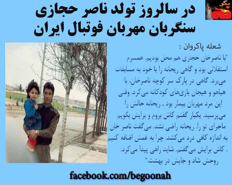 «با ناصرخان حجازي هم محل بوديم. همسرم استقلالي بود و گاهي ريحانه را با خود به مسابقات ميبرد. گاهي در پارک سر کوچه ناصرخان، با هياهو و هيجان بازيهاي کودکانه ميکرد. وقتي اين مرد مهربان بيمار بود , ريحانه حالش را ميپرسيد. يکبار گفتم کاش بروم و برايش بگويم ماجراي تو را. ريحانه راضي نشد. ميگفت ناصر خان به اندازه کافي درد ميکشد. چرا به غمش اضافه کنيم. کاش برايش ميگفتم. شايد راهي پيدا ميکرد.