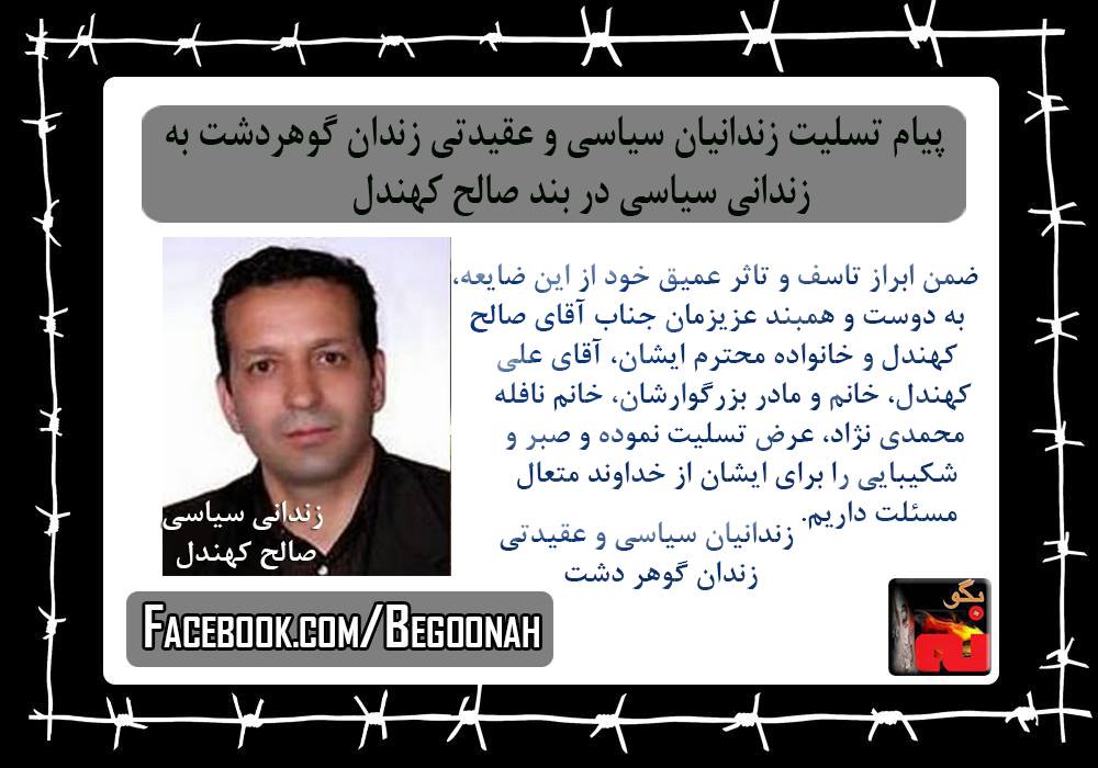 پیام تسلیت زندانیان سیاسی و عقیدتی زندان گوهردشت به زندانی سیاسی دربند صالح کهندل