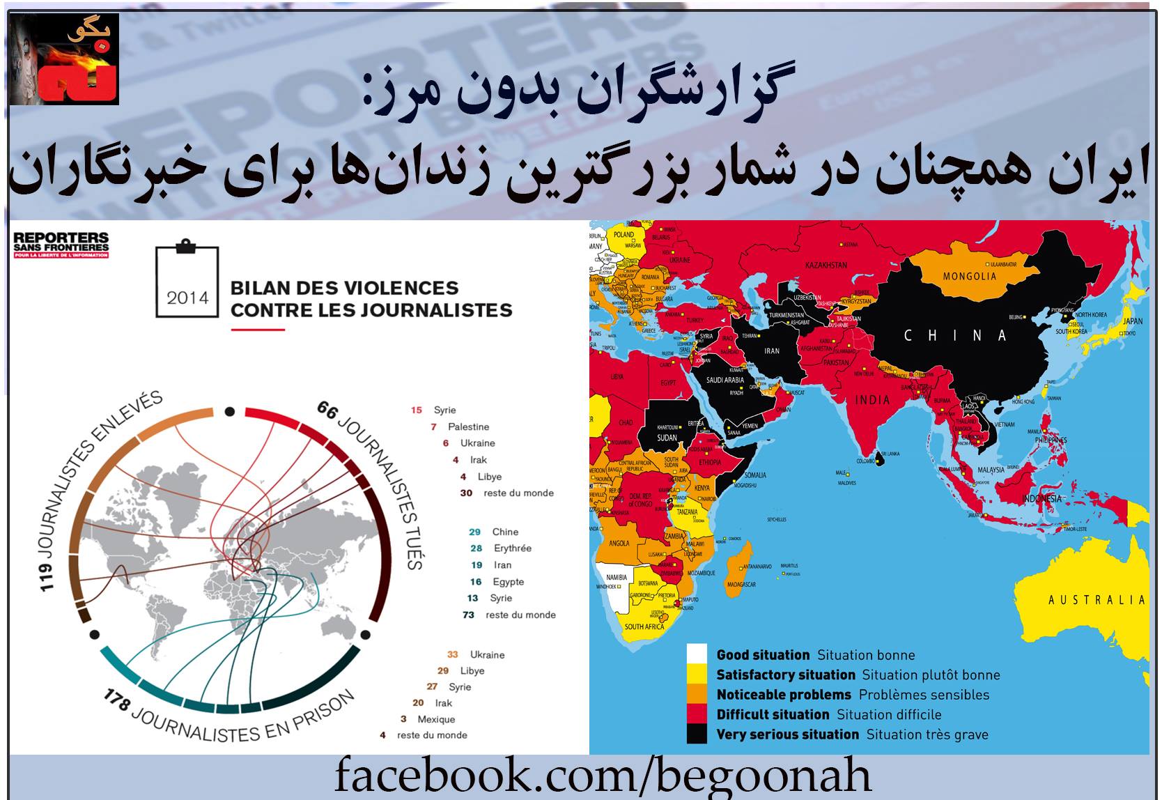 خطرناکترین کشور جهان برای خبرنگاران در سال ۲۰۱۴ میلادی، سوریه ، فلسطین به ویژه نوار غزه، شرق اوکراین، عراق و لبنان ذکر شدهاند ایران همچنان در شمار بزرگترین زندانها برای خبرنگاراناست. شمار خبرنگارانی نیز که به دلیل فعالیت حرفهای خود در زندان به سر میبرند در سال ۲۰۱۴ میلادی در سراسر جهان به ۱۷۸ نفر رسیده است.
