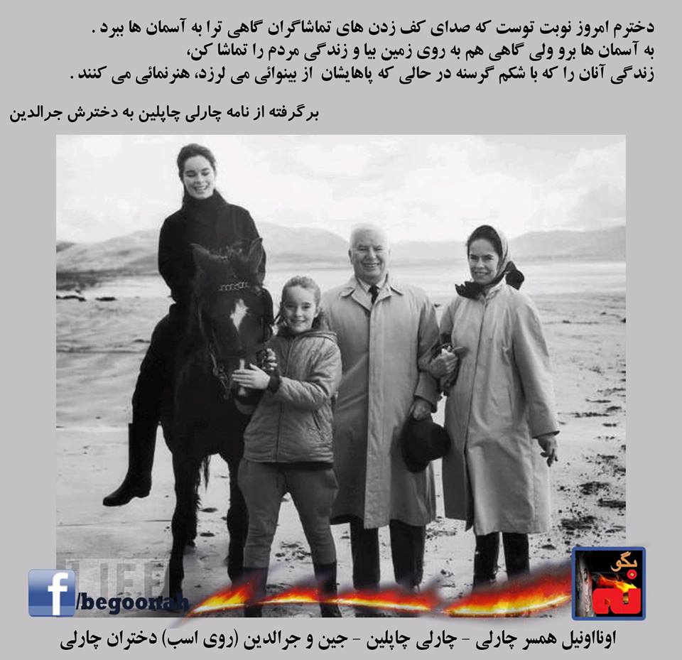 از این رو دل به زر و زیور مبند، بزرگترین الماس این جهان آفتاب است که خوشبختانه بر گردن همه می درخشد ….. اما اگر روزی دل به آفتاب چهره مردی بستی، با او یکدل باش و به راستی او را دوست بدار و معنی این امر و وظیفه خود را در قبال این موضوع بدان . به مادرت گفته ام که در این خصوص برای تو نامه ائی بنویسد . او بهتر از من معنی عشق را می داند . او برای تعریف عشق که معنی آن یکدلی است شایسته تر از من است …… دخترم، کار تو بس دشوار است . این را می دانم که بر روی صحنه باله جز تکه ای حریر، بدن نیمه عریان بالرین را چیزی نمی پوشاند، شاید به خاطر هنر بتوان به خود اجازه داد بالرین بود و با بدن نیمه عریان روی صحنه رفت اما شرافت ایجاب می کند که باید پوشیده تر از صحنه بازگشت و هیچکس و هیچ چیز دیگر را در این جهان نمی توان یافت که شایسته آن باشد که دختری حتی ناخن پای خود را به خاطر آن عریان کند …. برهنگی بیماری عصر ماست . من پیرمرد چارلی چاپلین پدر تو حرف های خنده دار می زنم، اما سعی کن که از آن ده سال پیشتر باشی، مسلماً پیر نخواهی شد ولی از این بندهای عریانی و زیان های آن دور خواهی ماند . به گمان من تن عریان تو باید مال کسی باشد که روحش را برای تو عریان کرده است . دوم جرالدین برای تو حرف های بسیار دارم ولی به موقع دیگر می گذارم و با این آخرین پیام، نامه ام را پایان می بخشم .