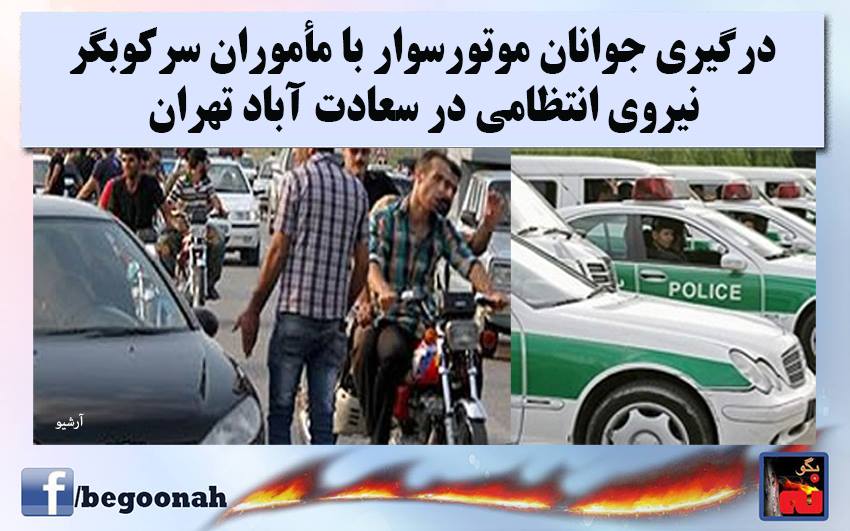 بنا به خبر دریافتی ،روز یکشنبه ۱۴ دیماه تعدادی ازجوانان موتور سوار در سعادت آباد تهران در حرکت بودند که مأموران سرکوبگر نیروی انتظامی به قصد اخاذی و به بهانه غیرمجاز بودن موتورها قصد توقف موتورهای آنها را داشتند که منجر به درگیری جوانان با مأموران شد و مزدوران نیروی انتظامی چند نفر از جوانان را دستگیر کردند.