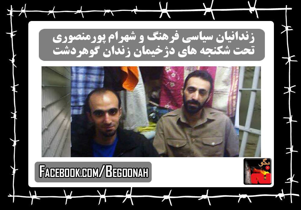 به گزارش كانون حمايت از خانواده جان باختگان و بازداشتي ها ، دو برادرِ زنداني محكوم به حبس ابد، بنامهاي فرهنگ و شهرام پور منصوري كه هم اكنون در زندان گوهردشت كرج محبوس هستند ، مستمرا توسط مأموران دژخیم اطلاعات و شكنجه گران زندان گوهردشت مورد اذيت و آزار و تهديد قرار دارند. هر دو زنداني توسط مأموران زندان تهديد شده اند كه در صورت رسانه اي كردن و فاش ساختن شكنجه هايي كه بر عليه آنان اعمال شده است هر دو با شكنجه هاي جدي از قبيل تجاوز بوسيله باتوم روبرو خواهند بود. اين دو زنداني چندين بار بصورت برهنه در سلولهاي انفرادي مورد تحقير وشكنجه هاي جسمي و روحي قرار گرفته اند.اتهام اين دو برادر اختلال در امنيت پرواز در مسير اهواز- بندر عباس ميباشد و در زمان دستگيري و بازداشت آنان زير 18 سال سن داشتند و ابتدا به اعدام محكوم شدند و سپس حكم آنان به حبس ابد تقليل يافته است. هر دو برادر در بدو دستگيري مورد شكنجه هاي كثيف از طرف مأموران وزارت اطلاعات و قضاييه زندان قرار گرفته اند و هر از چند گاهي اين شكنجه ها جهت اعمال فشار و خود داري آنان از رسانه اي كردن شكنجه هايشان بر عليه آنان مجددا اعمال ميشود.