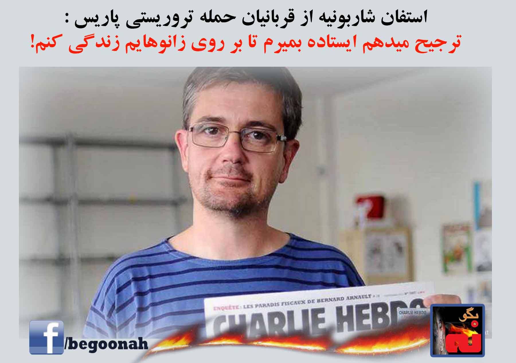 استفان شاربونیه سردبير هفته نامه فرانسوي شارلي كه در 7 ژانويه 2015 به قتل رسيد، در مصاحبه اي در سال 2012 گفت بود :من از تلافی جویان نمیترسم زیرا نه فرزند دارم، نه همسر، نه اتومبیل، نه بدهی به بانک… با اینکه طنینی پر طمطراق دارد، اما ترجیح می دهم ایستاده بمیرم تا به زانو در آمده زندگی کنم