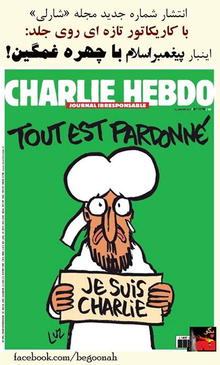 به گزارش روزنامه فرانسوی «لیبراسیون» در تازهترین شماره نشریه «شارلی ابدو» که قرار است روز چهارشنبه ۲۴ دی، به فروش برسد، کارتونی از پیامبر اسلام با چهره اي غمگين و اشكبار کشیده شده که نشان «من شارلی هستم» را در دست دارد، كه بيانگر بيزاري پيامبر خدا از اعمال تروريستي تحت نام اسلام مي باشد.