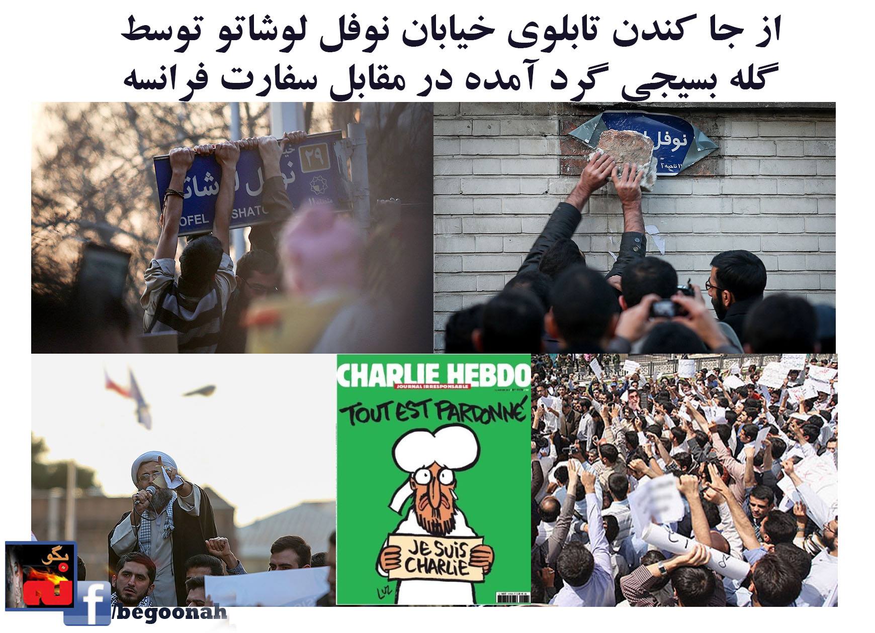 گالری فیلم و تصویر اوباش بسیجی که به بهانه کاریکاتور نشریه «شارلی ابدو» در مقابل سفارت فرانسه در تهران جمع شده بودند، تابلوی خیابان «نوفل لوشاتو»، خیابان محل سفارت فرانسه را از جا کندند! Date: ژانویه 20, 2015Author: begoonah 0 دیدگاه اشتراکگذاری این:بیشتر به اشتراک گذاشتن در فیسبوک (در پنجرۀ تازه باز میشود) فیسبوک اشتراکگذاری در X (در پنجرۀ تازه باز میشود) X چاپ (در پنجرۀ تازه باز میشود) چاپ اشتراکگذاری در تلگرام (در پنجرۀ تازه باز میشود) تلگرام اشتراکگذاری در واتساپ (در پنجرۀ تازه باز میشود) واتساپ