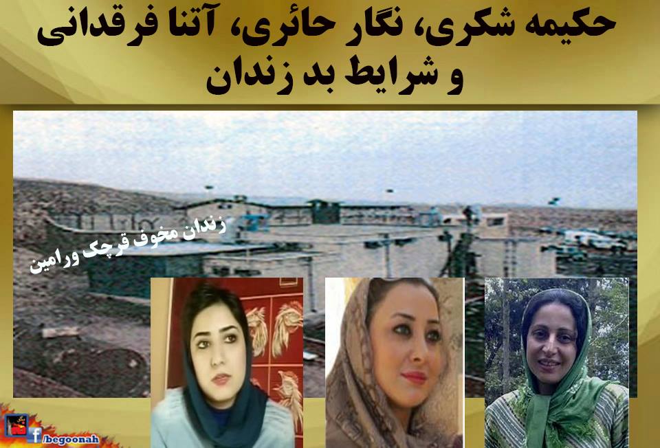 بگونه: حکیمه شکری، نگار حائری و آتنا فرقدانی سه زندانی که در شرایط بد زندان قرچک ورامین به سر میبرند، زندان مذکور را فاقد استانداردهای لازم برای نگهداری هر زندانی با هر نوع جرم و اتهامی میدانند. تعداد زندانیانی که در این زندان نگهداری میشوند، بسیار بالاتر از ظرفیت واقعی این زندان است. سرویسهای بهداشتی و به طور کل بهداشت یکی از مشکلات عدیده زندانیان در این زندان میباشد. کیفیت غذا به حدی است که خواهر حکیمه شکری عنوان میکند که زندانی تنها برای زنده ماندن مجبور به خوردن این غذاست.