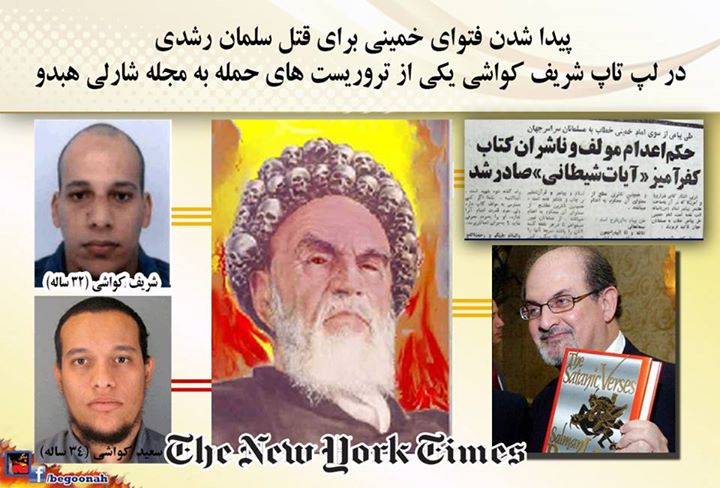 اخبار پیدا شدن فتوای خمینی برای قتل سلمان رشدی در لپ تاپ شریف کواشی یکی از تروریست های حمله به مجله شارلی هبدو Date: ژانویه 25, 2015Author: begoonah 0 دیدگاه بگزارش نیویورک تایمز در لپتاپ شریف کواشی یکی از برادران تروریست در حمله به مجله شارلی ابدو مدارکی مبنی بر تایید فتوای قتل سلمان رشدی توسط خمینی یافت شده است. #بگونه #ایران #تروریست #شارلی_ابدو اشتراکگذاری این:بیشتر برای اشتراکگذاشتن فیسبوک خود کلیک کنید (در پنجرۀ تازه باز میشود) فیسبوک اشتراک گذاشتن توسط اس ام اس (در پنجرۀ تازه باز میشود) X برای چاپ کردن کلیک کنید (در پنجرۀ تازه باز میشود) چاپ برای اشتراکگذاری روی Telegram کلیک کنید (در پنجرۀ تازه باز میشود) تلگرام برای اشتراکگذاری روی WhatsApp کلیک کنید (در پنجرۀ تازه باز میشود) واتساپ