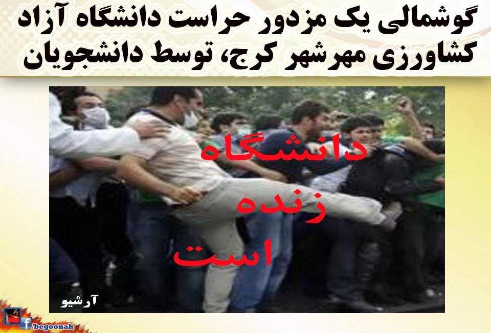 بگونه: دانشجویان دانشگاه آزاد کشاورزی مهرشهر کرج در مواجهه با ممانعت مزدور حراست دانشگاه از ورود یکی از دوستانشان به دانشگاه، به بهانة آخوند ساختة سر و وضع و پوشش، به مزدور تذکر دادند که امروز روز امتحان است.