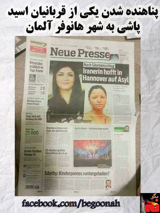 بگونه: يك روزنامه آلماني با چاپ عكسي از يكي از قربانيان اسيد پاشي در ايران از پناهنده شدن وي به شهر هانوفر آلمان خبر داد.